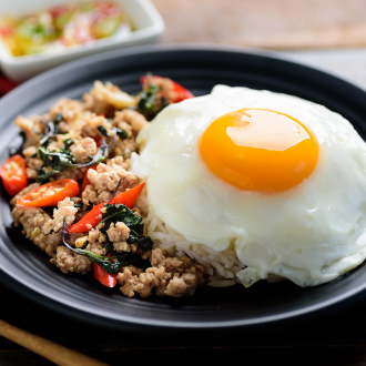 กะเพราไก่ไข่ดาวรสจัดจ้าน เป็นเมนูเนื้อไก่ ผัดแบบปห้งๆ หอมใบกะเพราแดง ทานกับไข่ดาวกรอบไม่อมน้ำมัน